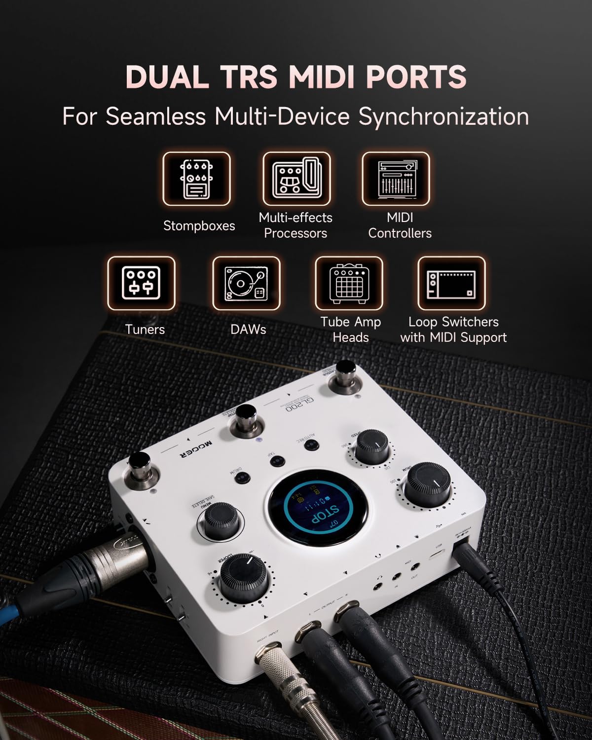 - [MIDI Input/Output Jacks]Dual TRS MIDI ports for seamless multi-device synchronization. For example: Stompbox, Multi-effects Processor, MIDI Controller, Tuner, MIDI Sequencer / DAW, MIDI-capable Tube Head / MIDI-capable Preamp, MIDI-controllable Loop Switcher